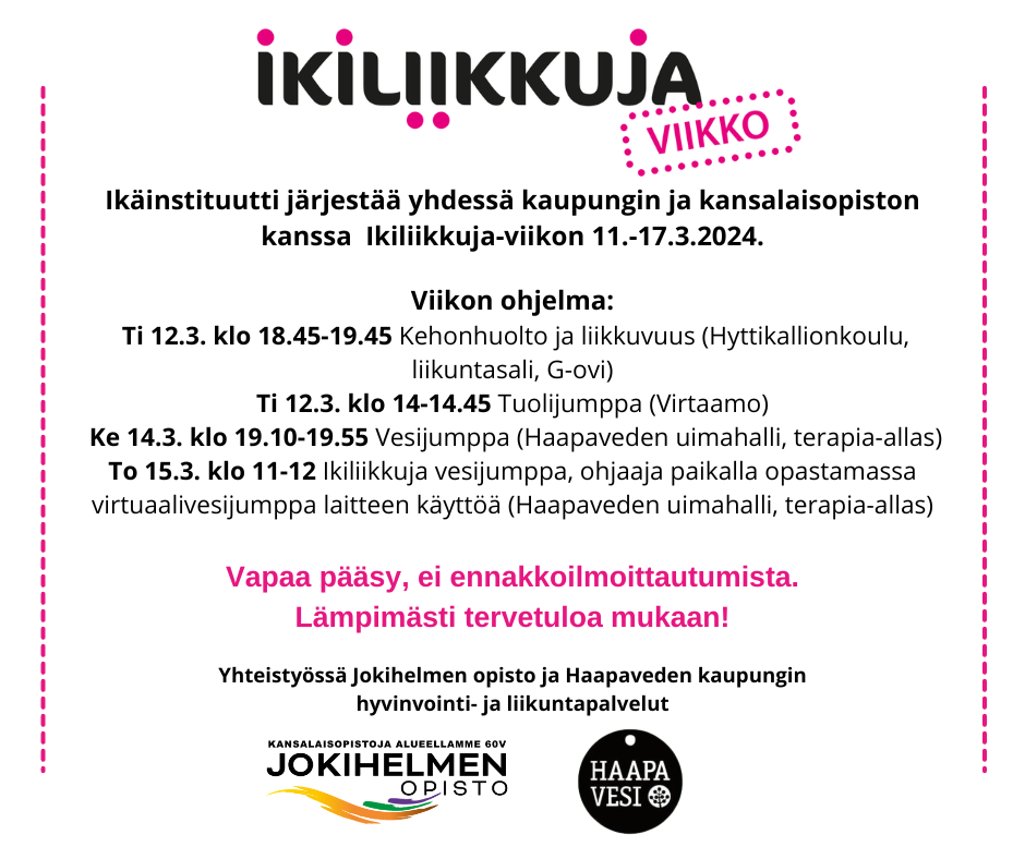 Ikäinstituutti järjestää yhdessä kaupungin ja kansalaisopiston kanssa Ikiliikkuja-viikon 11.-17.3.2024.