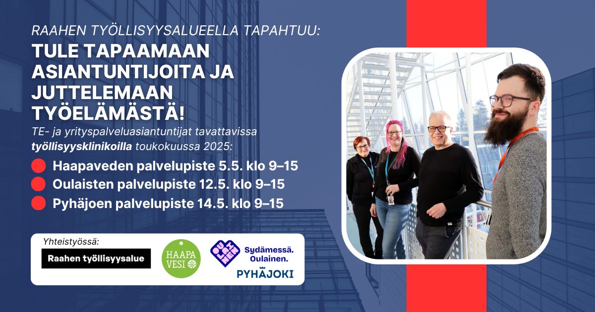 Toukokuun 2025 aikana työllisyysklinikat järjestetään Haapaveden palvelupisteen lisäksi Oulaisten ja Pyhäjoen palvelupisteissä. Työllisyysklinikat jatkuvat kesäkuun alussa Siikajoella ja Raahessa.