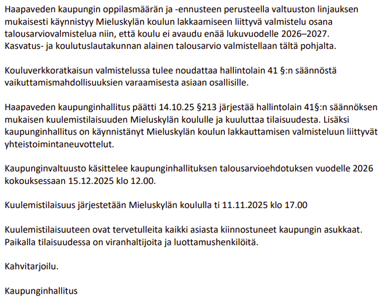 Vaikuttamismahdollisuuksien varaaminen kouluverkkoratkaisussa, Kuulemistilaisuus Mieluskylän koululla 11.11.2025 klo 17.00 Kuulutus_kuuleminen_Mieluskylä_2025.pdf To, 16.10.2025 - 15:32