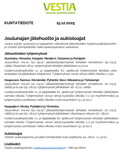 Vestian kuntatiedote 15.12.2025: Joulunajan jätehuolto Vestia Oy - Kuntatiedote 15.12.2025 - Joulunajan jätehuolto.pdf Ma, 15.12.2025 - 15:30