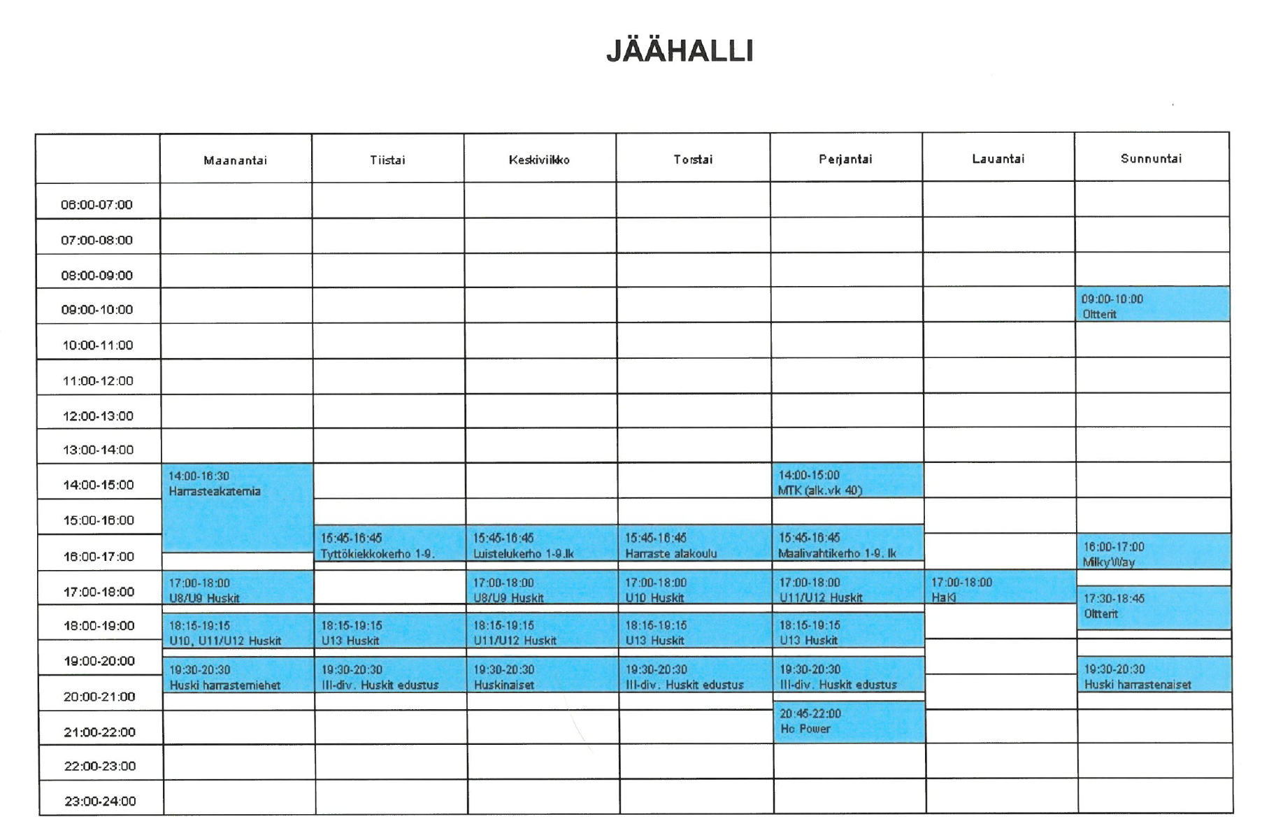 • Joukkueiden vakiovuorot arki-iltaisin klo 16- 23 ja viikonloppuisin  (Joukkueille ilmoitettuina aikoina).