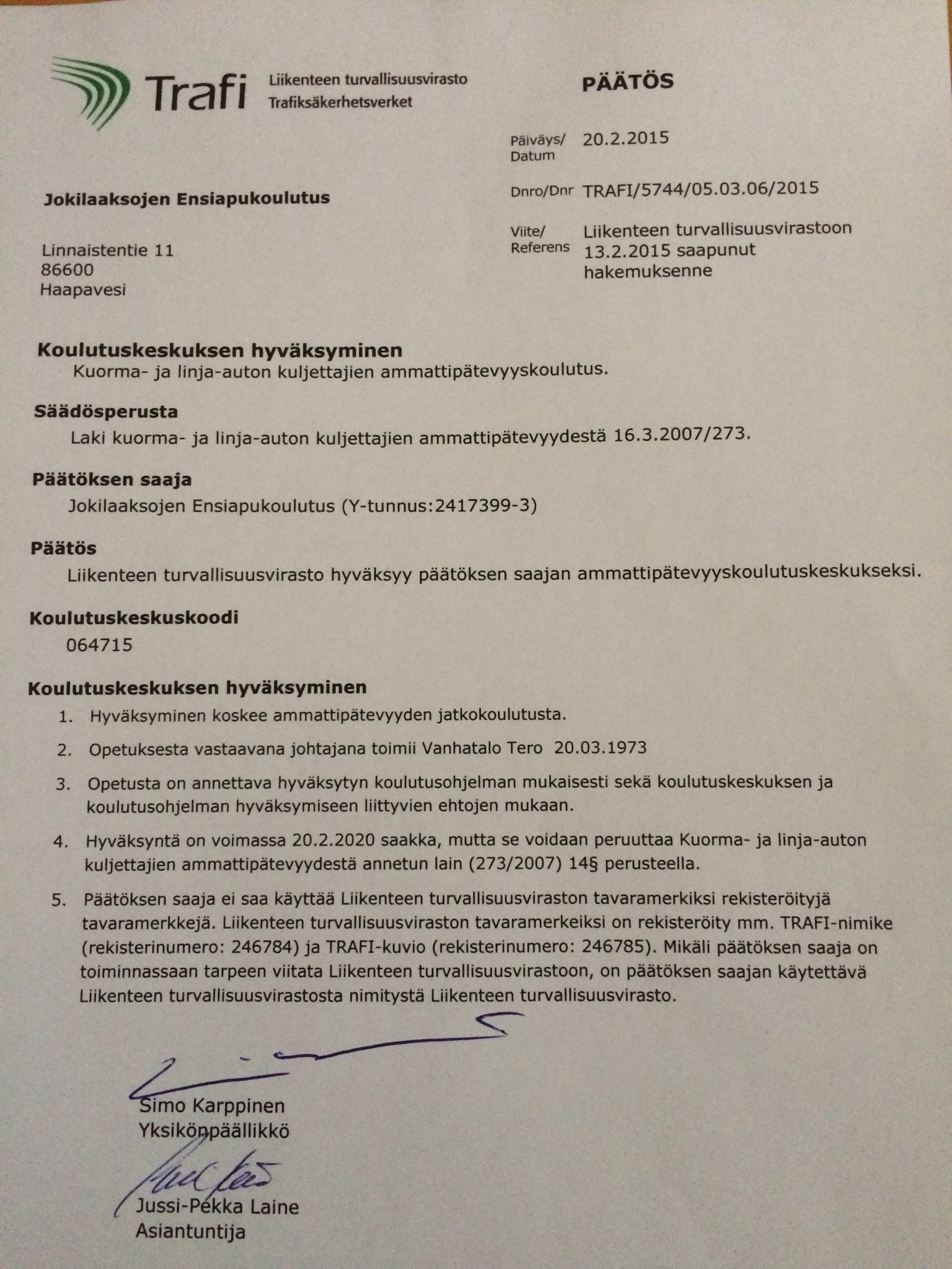Jokilaaksojen Ensiapukoulutus järjestää ammattipätevyyskoulutuksena Tieturva 1 -koulutuksen. Koulutuksen hinta on 124€, sis. Alv 24%. Hinta sisältää lounaan sekä aamu- ja iltapäiväkahvit lisukkeineen. Lisäksi ammattipätevyysmaksu 17€ + alv. 24% trafimerkinnän tarvitsijoille. Kortti ja kirja 17€.