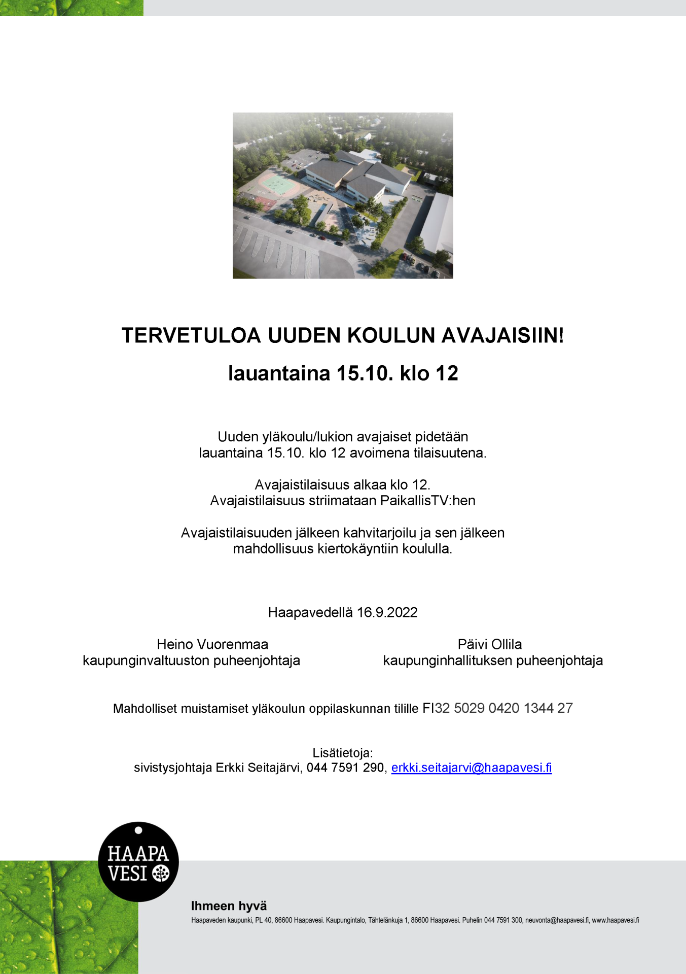 Uuden yläkoulun/lukion avajaiset pidetään la 15.10.2022 klo 12 alkaen. Avajaistilaisuus striimataan Paikallis-TV:n kautta. Avajaistilaisuuden jälkeen kahvitarjoilu ja sen jälkeen mahdollisuus kiertokäyntiin koululla.