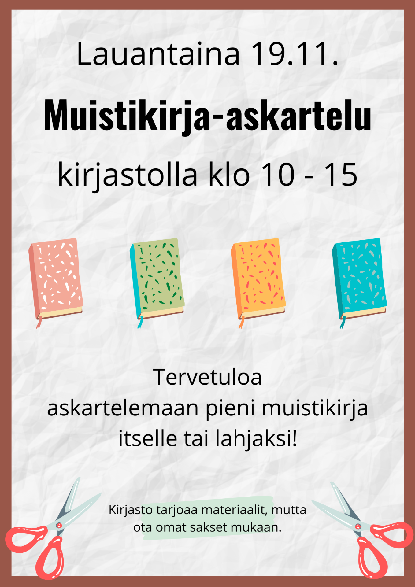 lauantaina 19.11. askartelupaja, jossa voi tehdä erilaisia pieniä muistikirjoja.