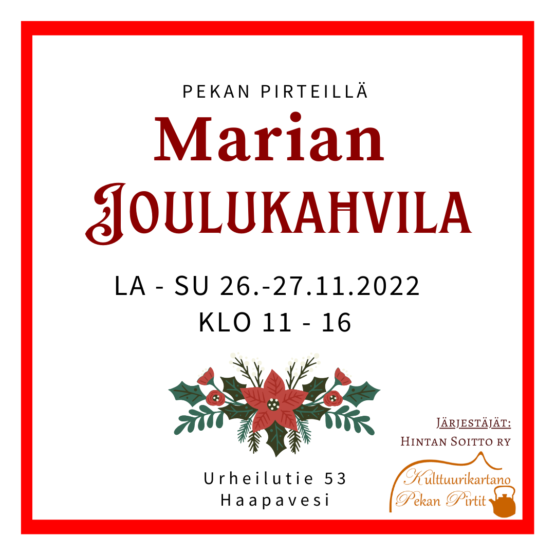 Marraskuun viimeisenä viikonloppuna Marian joulukahvila avaa ovensa la-su 26.-27.11. klo 11-16 väliselle ajalle. Kokoa perhe sekä ystävät mukaan, ja suuntaa ensimmäisen adventtiviikonlopun kunniaksi herkuttelemaan joulukauden leivonnaisilla sekä tekemään lahjaostoksia Pirtin joulupuodista.