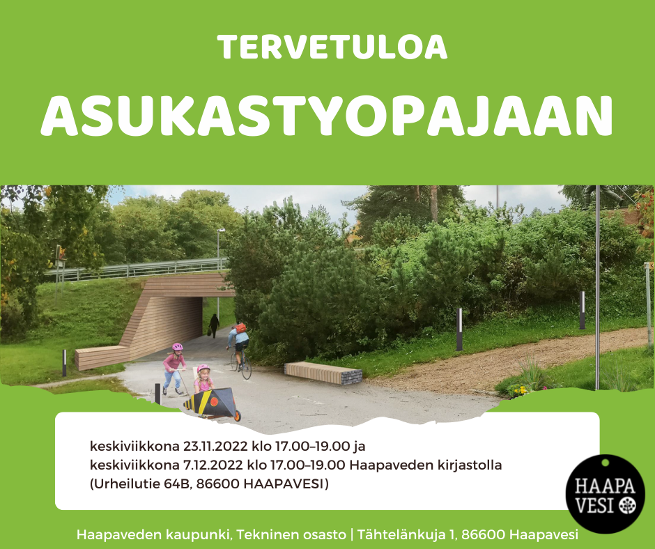 Asukastyöpaja on osa Haapaveden kaupungin valmistelemaa taajaman viheralueohjelmaa, jonka tavoitteena on selvittää muun muassa kaupungin omistaman taajaman viheralueverkon nykytilaa ja kehittymistarvetta tulevan kymmenvuotiskauden aikana.