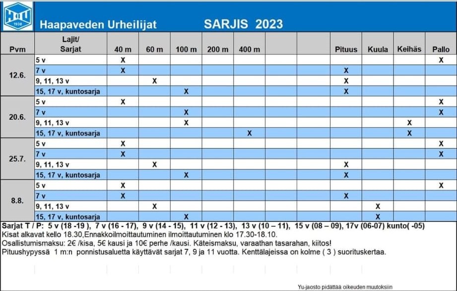 Osallistumismaksu: 2€/kisa, 5€/kausi ja 10€ perhe/kausi. Käteismaksu, varaathan tasarahan!