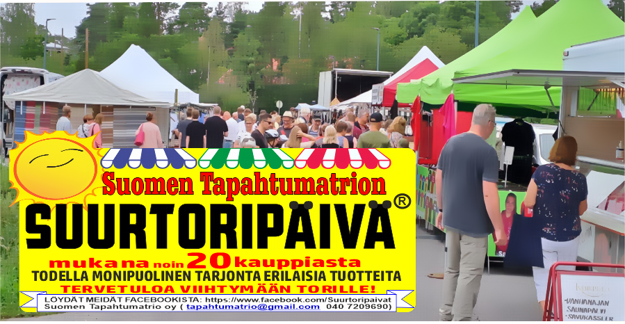 Suomen Tapahtumatrio oy:n Suurtoripäivä on isompi toripäivä kuin useimmilla paikkakunnilla toripäivät normaalisti, mutta pienemmät kuin markkinat. Siksipä me ollaankin koottu tämä meidän oma kauppiasporukka erilaisten tuotteiden myyjistä, että saadaan tarjottua teille mahdollisimman laaja ja monipuolinen kattaus.