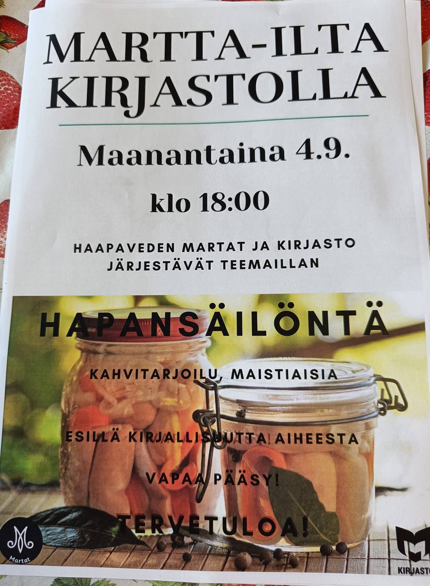Teemana hapansäilöntä. Kahvitarjoilu, maistiaisia. Esillä kirjallisuutta aiheesta. Vapaa pääsy.