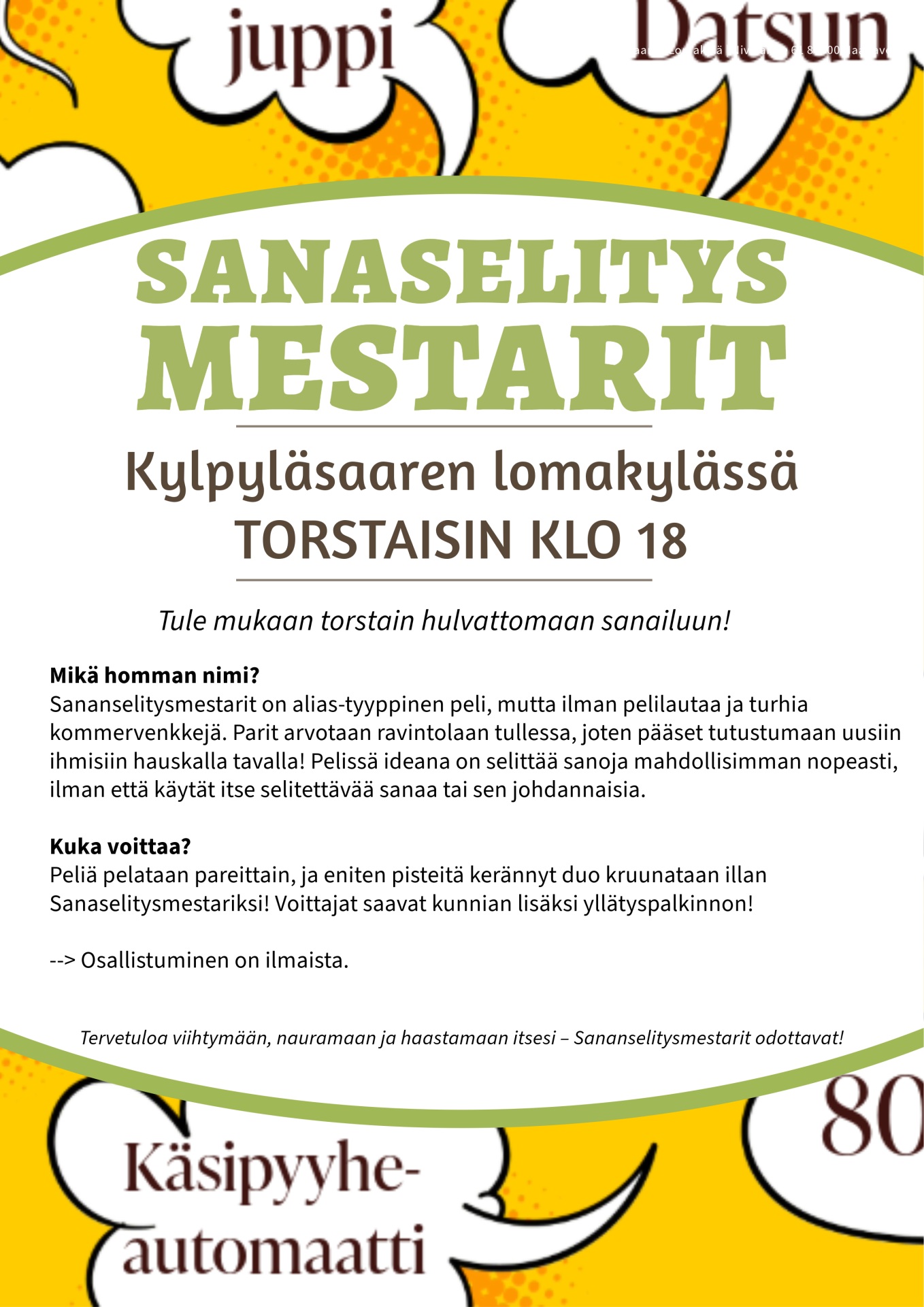 💬 Oletko nopea sanankäyttäjä? Tai loistatko selitystaidoillasi? Nyt on tilaisuutesi näyttää sanaselityksen mestaruutta Kylpyläsaaren uudessa viikoittaisessa pelissä – SANASELITYSMESTARIT!