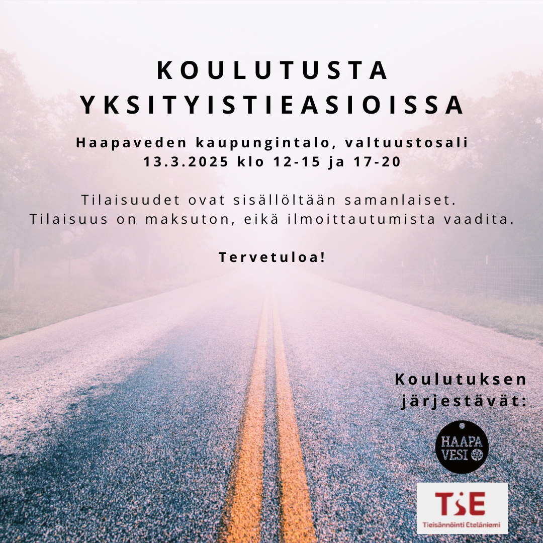 Tervetuloa yksityistieasioiden koulutustilaisuuteen Haapaveden kaupungintalon valtuustosaliin 13.3.2025 klo 12-15 ja 17-20. Tilaisuudet ovat sisällöltään samanlaiset.