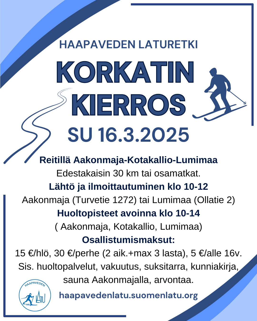 -Lähtö ja ilmoittautuminen klo 10-12, Lumimaa (Ollatie 2) tai Aakonmaja (Turvetie 1272)Ilmoittautumisen yhteydessä saat suksitarran ja arpalipun. (Voit ilmoittautua myös ennakkoon 14.3 mennessä: lyytinen_raisa@hotmail.com Maksu Haapaveden Ladun tilille FI 82 5029 0420 0043 23, viite Korkatin kierros/oma nimi)