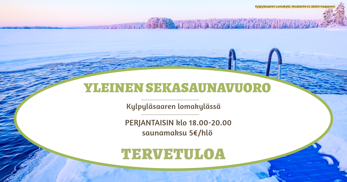 Kylpyläsaaressa lämpeää yleinen sekasauna nyt myös perjantaisin ja silloin kaikki ovat tervetulleita saunomaan klo 18-20. Avantokin on käytössä niin kauan kun jäitä riittää :)