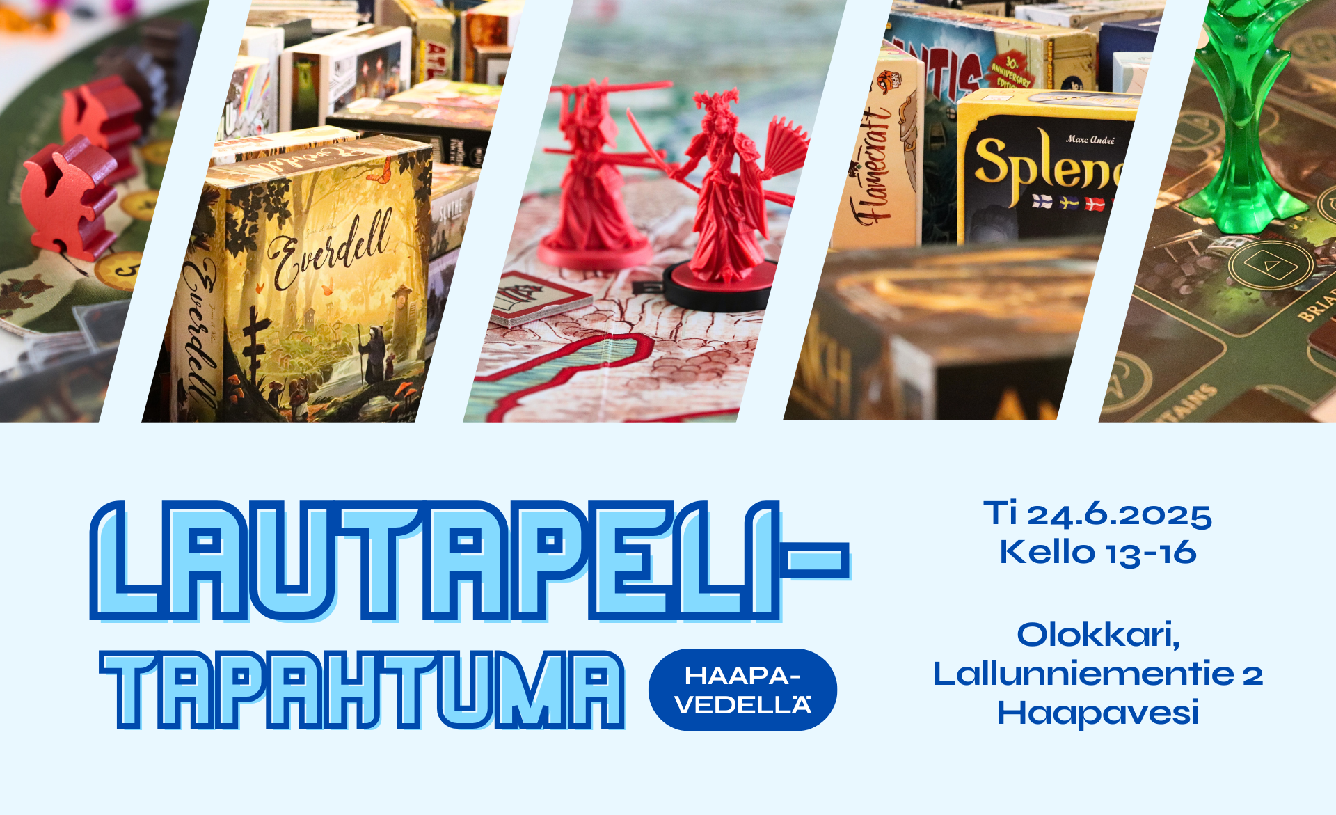 Jokilaaksojen Pelaajien vapaaehtoiset järjestävät lautapelitapahtuman Haapavedellä tiistaina 24.6.2025 kello 13-16. Maksuton tapahtuma järjestetään Yhteisö- ja kerhotila Olokkarissa, Kerhotila 2 -tilassa (Lallunniementie 2).