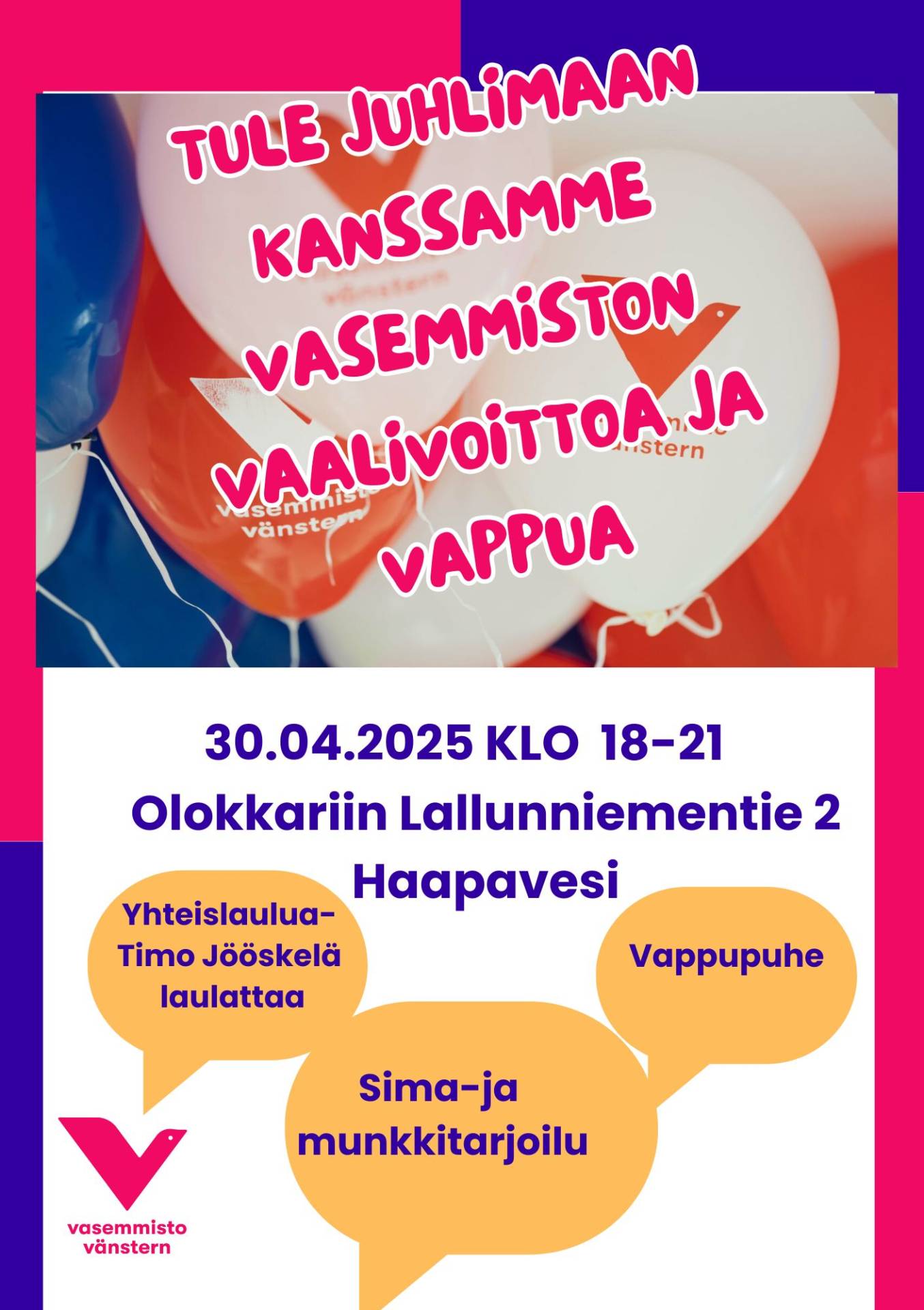 Tule juhlimaan vappuaattona kanssamme Vasemmiston menestystä kunta- ja aluevaaleissa, vappua ja kevättä.
