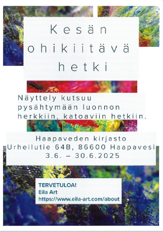 Haapaveden kirjaston kesäkuun taidenäyttelynä on Eila Heikkilän "Kesän ohikiitävä hetki". Näyttely kutsuu pysähtymään luonnon herkkiin, katoaviin hetkiin.