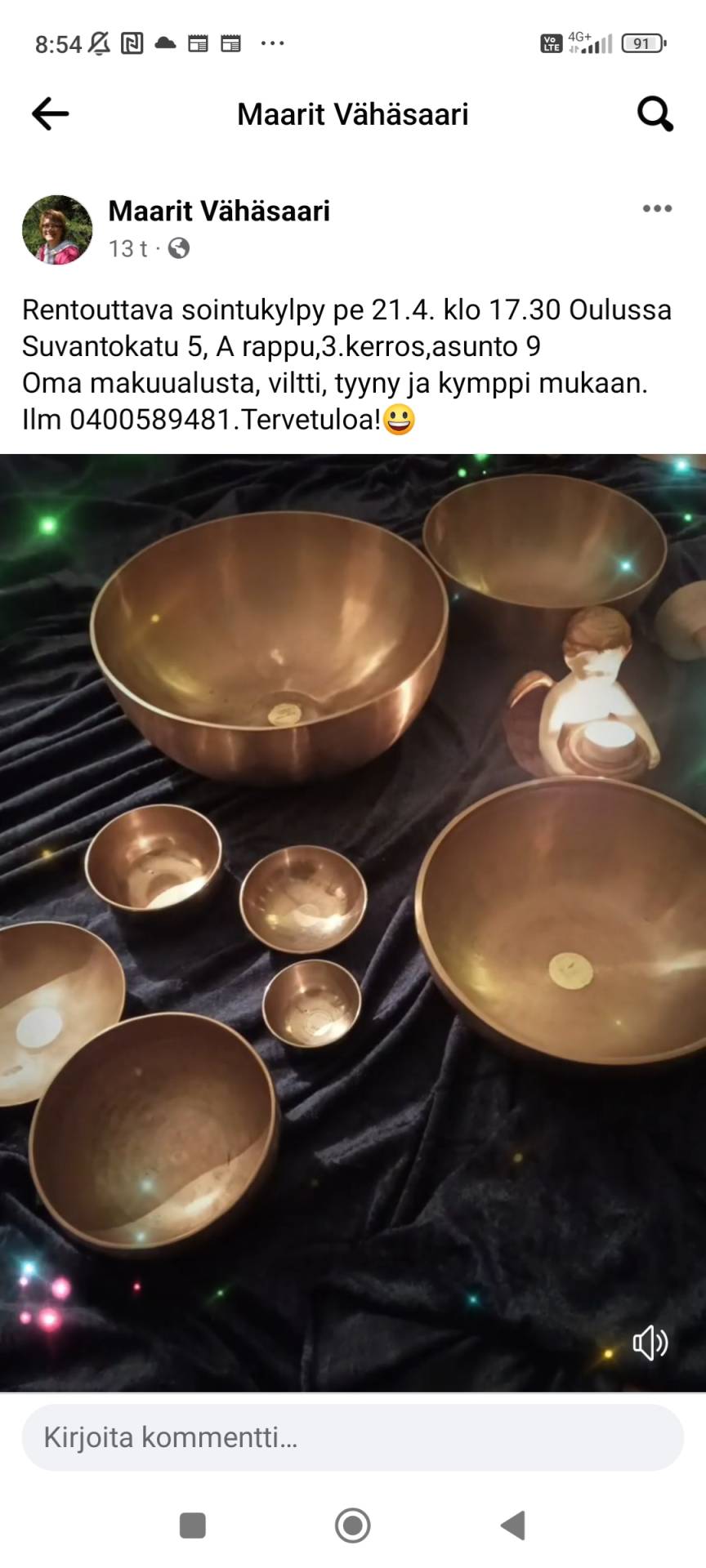Kaipaatko rentoutusta kehollesi, hetken pysähdystä mielellesi? Tervetuloa ryhmälle tehtävään sointukylpyyn eli äänimaljarentoutukseen! Äänimaljoista ja gongista lähtevät harmoniset ääniaallot etenevät kehossasi hienovaraisena "kuplivana" värähtelynä rentouttaen kehoa solutasolle asti. Äänet tasaavat sähköistä aivokäyrääsi rentouttaen sinua myös mielen tasolla.