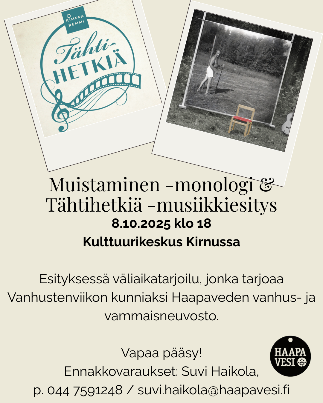 Esityksessä on väliaikatarjoilu, jonka tarjoaa Vanhustenviikon kunniaksi Haapaveden vanhus- ja vammaisneuvosto.