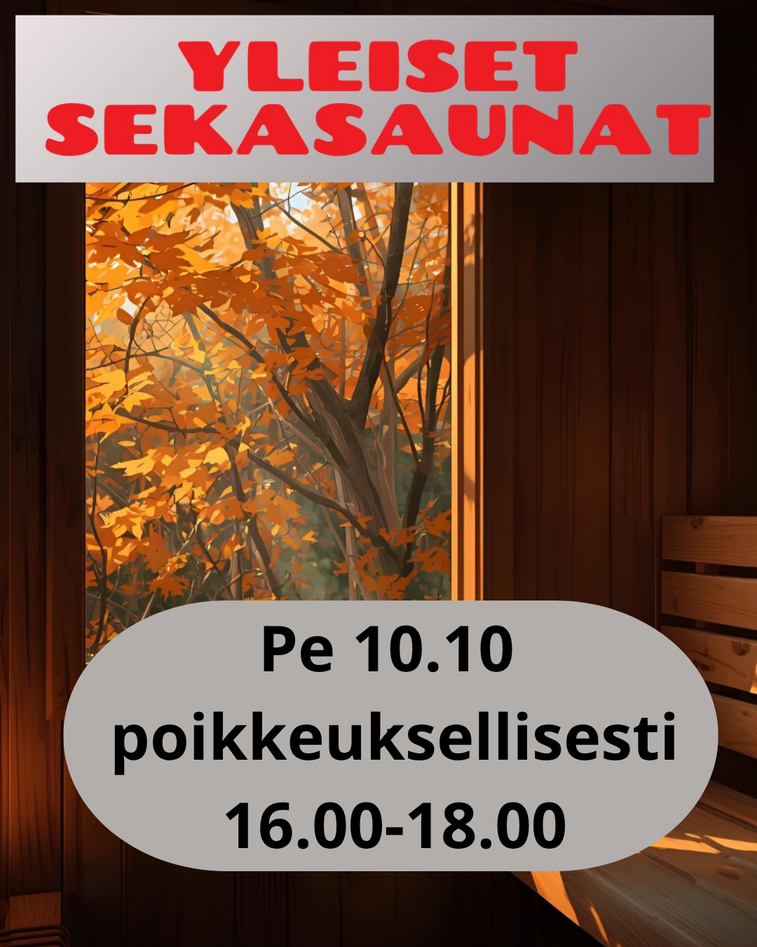 Tämän viikon sekasaunavuoro poikkeuksellisesti jo klo 16.00-18.00, saunamaksu 7 €