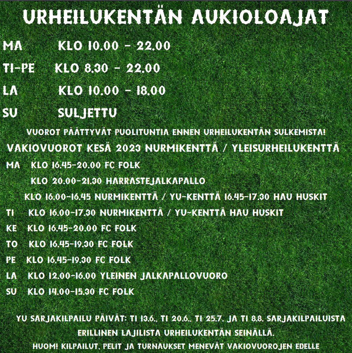 Urheilukentällä ei ole iltaisin henkilökuntaa, henkilökunnan tavoittaa arkipäivisin klo 8.00-16.00 välisenä aikana yllä olevista puhelinnumeroista.