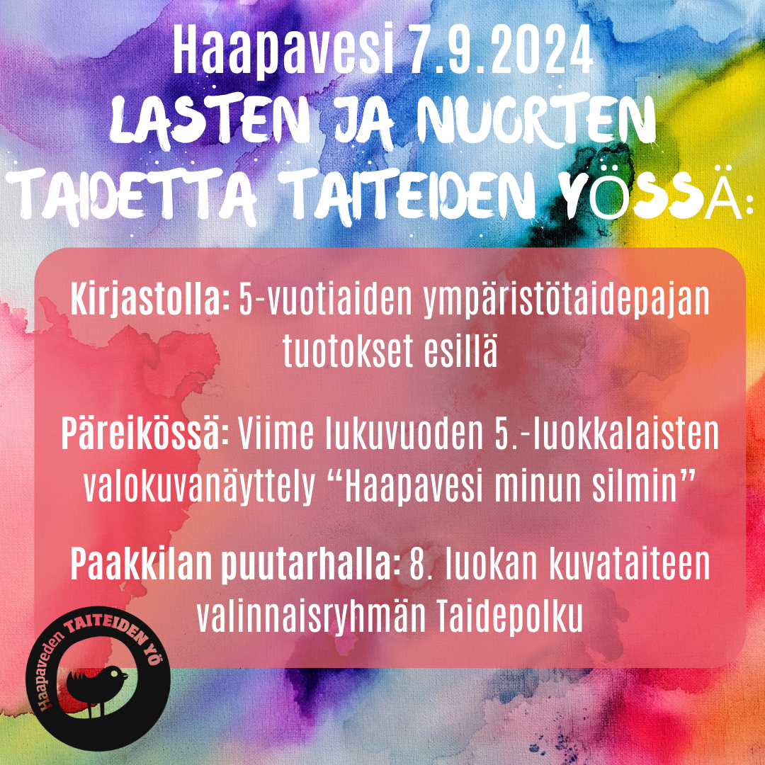 Taiteiden yönä 7.9.2024 pääsee ihailemaan haapavetisten lasten ja nuorten taidetta eri puolilla Haapavettä! 💜