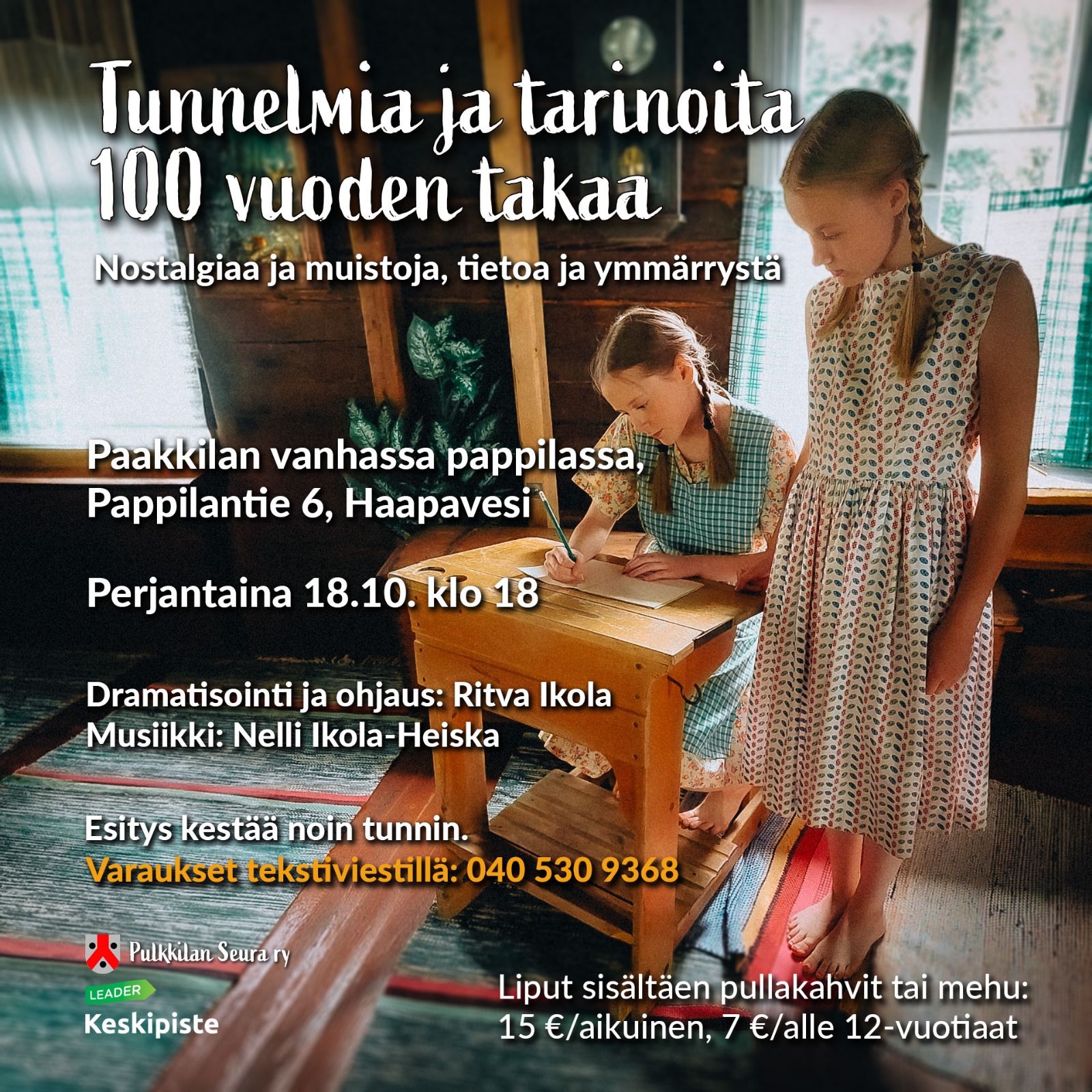 Esitys on koottu pulkkilalaisten lasten 1930-40 vuosien taitteessa kirjoittamista kouluaineista, muista muistiinpanoista ja musiikista.