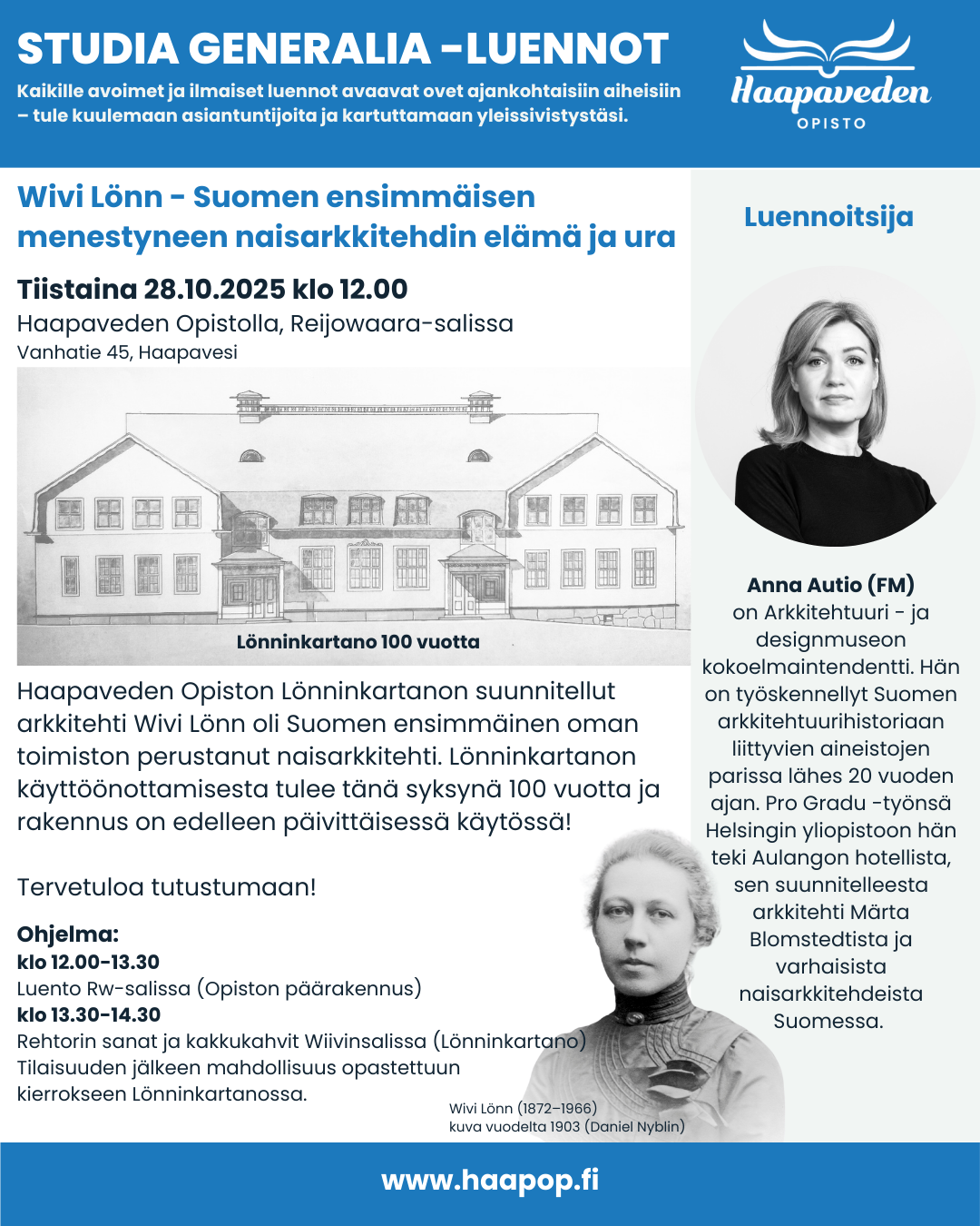 Tiesitkö, että Haapaveden Opiston Lönninkartanon on suunnitellut Suomen ensimmäinen oman toimiston perustanut naisarkkitehti Wivi Lönn? Tänä syksynä juhlimme rakennuksen 100-vuotista taivalta – ja sinutkin on kutsuttu mukaan!