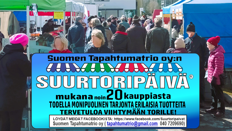 Suurtoripäivä tuo perinteistä mukavaa toritunnelmaa paikkakunnille noin 20 kauppiaan porukalla. Suomen Tapahtumatrio oy:n Suurtoripäivä on isompi toripäivä kuin useimmilla paikkakunnilla toripäivät normaalisti, mutta pienemmät kuin markkinat. Siksipä me ollaankin koottu tämä meidän oma kauppiasporukka erilaisten tuotteiden myyjistä, että saadaan tarjottua teille mahdollisimman laaja ja monipuolinen kattaus.