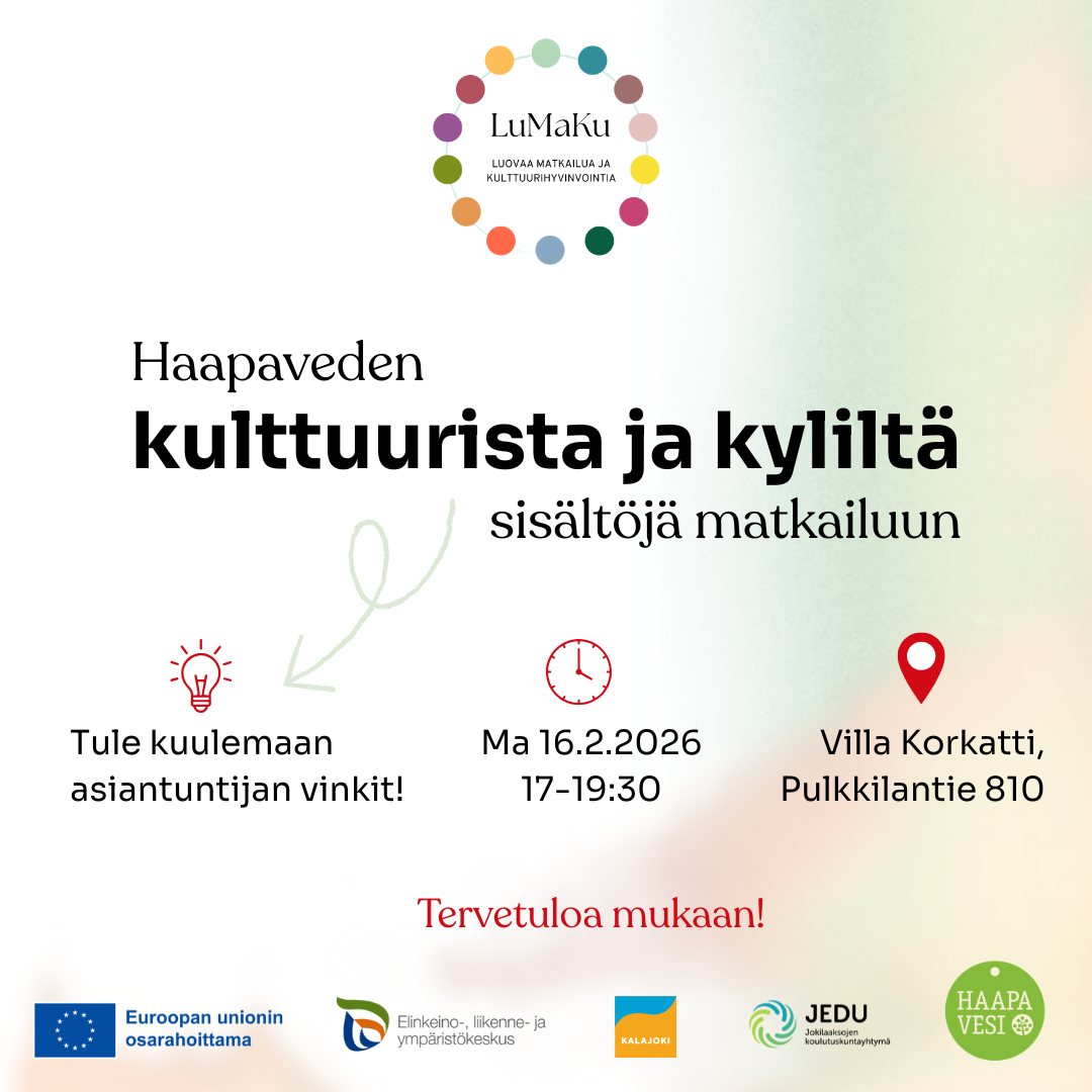 Tervetuloa mukaan kulttuurimatkailun iltaan maanantaina 16.2. klo 17-19:30, Haapaveden Villa Korkattiin (Pulkkilantie 810)!