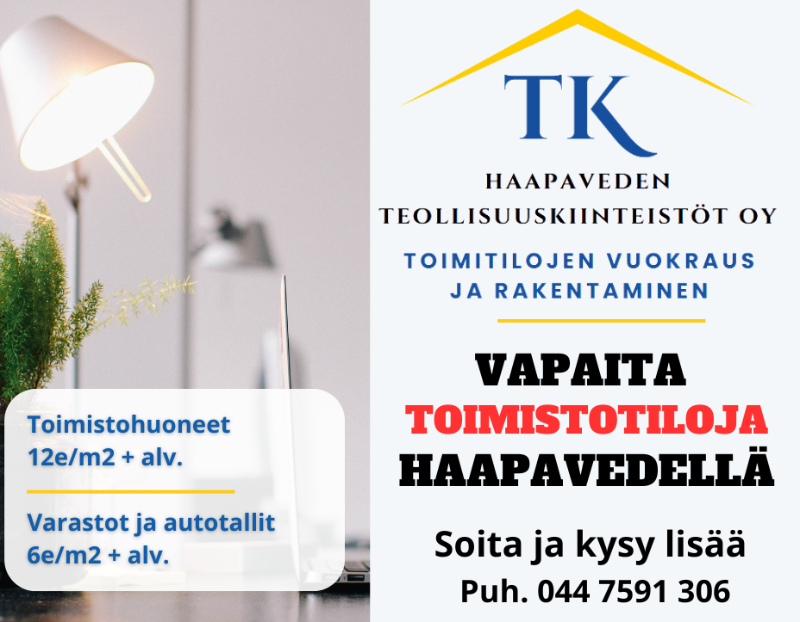 Haapavedellä on vuokrattavissa useita toimistohuoneita Teknologiakylässä osoitteessa uusitie 81 ja virastotalolla osoitteessa rynnäkkötie 1. Huoneiden koko noin 9-15 neliötä, mahdollisuus vuokrata myös isompia kokonaisuuksia. Neliöhinta 12e + alv. joka sisältää sähkön, veden ja lämmityksen.
